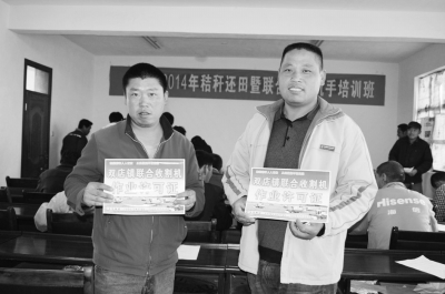 “禁燒秸稈人人有責(zé)任,從我做起不留高茬,今年夏季麥?zhǔn)?,我們一定?yán)格執(zhí)行政府規(guī)定的留茬高度,否則自愿接受5000元罰款。”5月11日,在江蘇省東海縣雙店鎮(zhèn)舉辦的秸稈還田暨聯(lián)合收割機(jī)手培訓(xùn)班上,來自宋莊村的兩名聯(lián)合收割機(jī)手捧著“雙店鎮(zhèn)聯(lián)合收割機(jī)作業(yè)許可證”表態(tài)說。為了從源頭上抓好秸稈禁燒,麥?zhǔn)盏絹碇H,雙店鎮(zhèn)政府與全鎮(zhèn)96名機(jī)手簽訂了麥?zhǔn)樟舨缈刂圃?0公分以內(nèi)責(zé)任書,規(guī)定任何沒有作業(yè)許可證和聯(lián)合收割機(jī)不安裝粉碎裝置的不得進(jìn)田收割。 宋彥偉攝