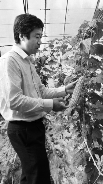 圖為天津科潤蔬菜研究所所長張斌在大棚內(nèi)觀察苦瓜生長情況。資料圖