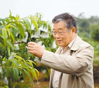 趙亞夫在檢查桃樹發(fā)育情況。