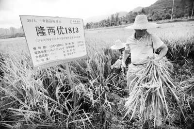 近日,“雜交水稻之父”袁隆平指導(dǎo)的第四期超級雜交稻攻關(guān)示范田在海南三亞收割,經(jīng)專家組驗收,這塊試驗田的“隆兩優(yōu)1813”新品種實測畝產(chǎn)為937.9公斤,理論畝產(chǎn)達1081.8公斤,在超級稻畝產(chǎn)1000公斤攻關(guān)中實現(xiàn)重要突破。此次在海南的攻關(guān)試驗,為下一步在其他省份大面積高產(chǎn)打下了基礎(chǔ)。專家表示,此次試驗受海南熱帶病蟲害影響較大,同時海南海拔低,晝夜溫差小,生長期短,如果在長江中下游等糧食主產(chǎn)區(qū)種植,產(chǎn)量會更高。圖為“隆兩優(yōu)1813”雜交水稻示范田收割現(xiàn)場。