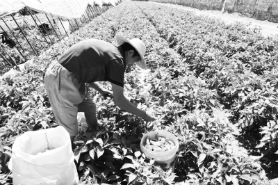 今年,在新疆生產(chǎn)建設(shè)兵團(tuán)第五師八十九團(tuán)農(nóng)技部門的指導(dǎo)幫助下,蔬菜種植戶紛紛引進(jìn)蔬菜新品種種植。蔬菜種植戶張世友采用大棚育苗、陸地移栽種植“天椒36號(hào)”辣椒,畝收入達(dá)萬(wàn)元。圖為7月10日,張世友正在采收辣椒。 劉世全周偉攝