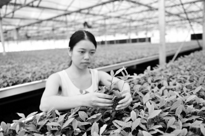 圖為該基地工人正在檢查茶樹苗的長勢。 張國榮宋成梓攝