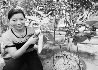 江蘇連云港海州區(qū)浦南鎮(zhèn)集瑞園公司開(kāi)發(fā)出西紅柿嫁接白茄子盆栽蔬菜。盆栽蔬菜取材方便,生長(zhǎng)快,病蟲(chóng)害少,常栽常新,不僅可以食用,而且色澤絢麗,具有極高的觀賞價(jià)值,每盆市場(chǎng)價(jià)格在100元左右。圖為7月29日,菜農(nóng)高娟正在查看茄子嫁接西紅柿生長(zhǎng)情況。 萬(wàn)民攝