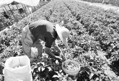 在新疆生產(chǎn)建設(shè)兵團(tuán)第五師八十九團(tuán)農(nóng)技部門(mén)的指導(dǎo)幫助下,該團(tuán)蔬菜種植戶紛紛積極引進(jìn)蔬菜新品種、新技術(shù),種植效益成倍增加。張世友今年就采用大棚育苗陸地移栽技術(shù),種植“天椒36號(hào)”辣椒,不僅個(gè)頭大,而且品質(zhì)好,畝收入可達(dá)萬(wàn)元。圖為張世友正在采收辣椒。 劉世全周偉攝