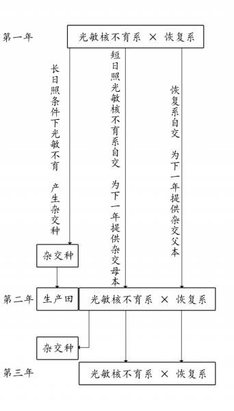 光敏核不育系,在長(zhǎng)日照條件下栽培作母本,恢復(fù)系作父本,配制雜交種子;而在短日照條件下,光敏核不育系自交繁殖生產(chǎn)下一年制種所需母本種子。這樣利用雜種優(yōu)勢(shì)時(shí)就可以不再需要保持系,由此可以節(jié)省大量人力和物力。