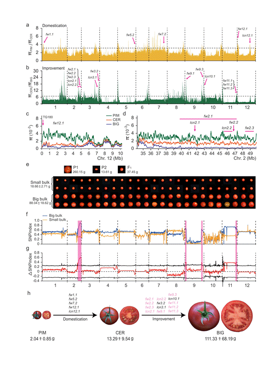 今天我們食用的大果栽培番茄是由野生番茄馴化而來的。在長期的馴化過程中,野生番茄果實在重量、顏色、形狀等方面發(fā)生了顯著變化。野生番茄果實非常小,重量僅1-2克,而現(xiàn)代栽培番茄的果重是其祖先的100多倍。然而,番茄人工馴化過程一直未有全面研究。通過群體遺傳學(xué)分析,該研究揭示了番茄果實變大經(jīng)歷了從醋栗番茄到櫻桃番茄再到大果栽培番茄的兩次進化過程,在此過程中分別有5個和13個果實重量基因受到了人類的定向選擇。
