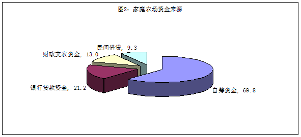 (五)資金來源呈現(xiàn)多元化。在全部被調(diào)查的家庭農(nóng)場(chǎng)中,自籌資金的比例達(dá)69.8%,銀行貸款的比例為21.2%,財(cái)政支農(nóng)資金的比例為13.0%,民間借款的比例為9.35(見圖2)。新型農(nóng)業(yè)經(jīng)營主體的資金來源仍以自籌資金為主,已初步具有金融意識(shí)。