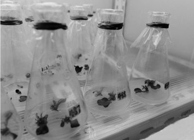 在組織培養(yǎng)室,筆者見到一組組擺放整齊的三角燒杯。技術(shù)員介紹,燒杯里放的是自制培養(yǎng)基,將青菜的葉片或者莖段放入其中,配合適宜的光照與溫濕度,經(jīng)過(guò)40天~60天就能培養(yǎng)出許多株小苗,主要用于親本(一般指動(dòng)植物雜交時(shí)所選用的雌雄性個(gè)體)的培養(yǎng),有助于提高蔬菜的加代育種速度。