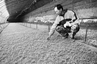 圖為4月6日,陶峰正在查看溫室大棚內(nèi)運(yùn)用微噴技術(shù)灌溉培育的菊花苗生長(zhǎng)情況。王永志攝
