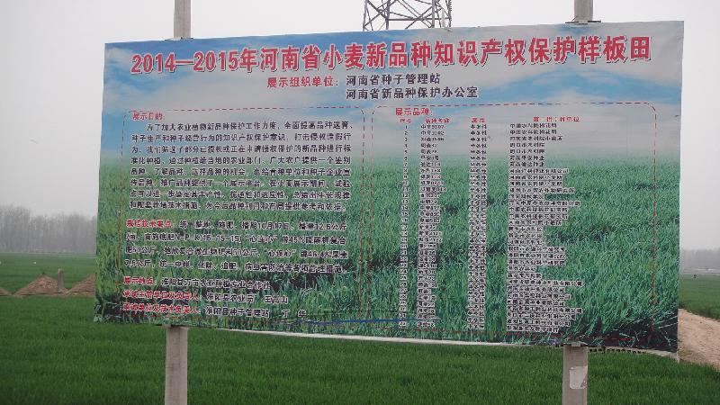 本次農(nóng)作物新品種知識(shí)產(chǎn)權(quán)保護(hù)小麥品種展示,共安排小麥新品種23個(gè)(見附件1),展示點(diǎn)分布在我省周口、駐馬店、漯河、許昌、鄭州、新鄉(xiāng)、濟(jì)源、鶴壁和濮陽等市(見附件2)。近期河南省種子管理站組織專家對(duì)展示情況進(jìn)行首輪檢查,大部分展示點(diǎn)的小麥新品種田間長勢(shì)喜人,已進(jìn)入打苞孕穗期,新優(yōu)品種的特征特性已初步顯現(xiàn),部分品種有望成為我省小麥品種的后起之秀。農(nóng)作物新品種知識(shí)產(chǎn)權(quán)保護(hù)品種展示,將為種子管理部門種子打假提供技術(shù)支撐,成為植物新品種維權(quán)鑒定的技術(shù)平臺(tái)。