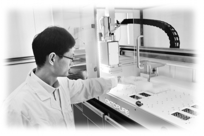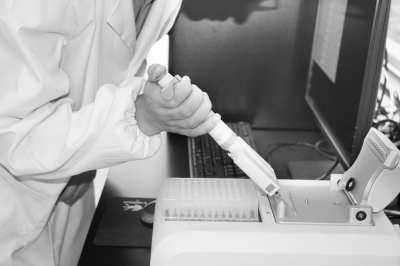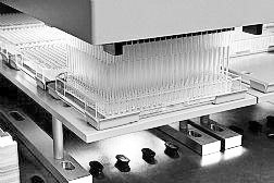 普通PCR儀(左)采用96孔板作為反應(yīng)載體,相比之下,384孔的陣列式分析卷帶(右)的特性更適合高通量全自動(dòng)化操作。 人工移液器和自動(dòng)化液體工作站,前者手工加樣,一人一天最多完成幾百份樣品DNA提取;后者利用自動(dòng)化儀器加樣,每天可以提取5000份以上的DNA樣品。 |