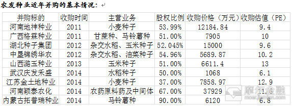 在收購(gòu)兼并這條道路上走得最堅(jiān)定的無(wú)疑是農(nóng)發(fā)種業(yè)。公司自2011年起,已累計(jì)投入6.24億元先后收購(gòu)8家種業(yè)公司。如果加上合資方式設(shè)立的中農(nóng)天泰以及農(nóng)藥公司河南穎泰,累計(jì)投入資金更是超過(guò)10億元。