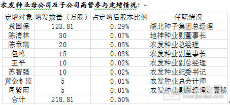 在母公司層面,公司在收購(gòu)河南穎泰的過(guò)程中,創(chuàng)造性地邁出了管理層股權(quán)激勵(lì)的第一步。在收購(gòu)資產(chǎn)的同時(shí),公司向現(xiàn)代種業(yè)基金、宋全啟以及農(nóng)發(fā)種業(yè)的8名高管定向增發(fā)股份募集配套資金,實(shí)現(xiàn)管理層與股東利益的綁定。
