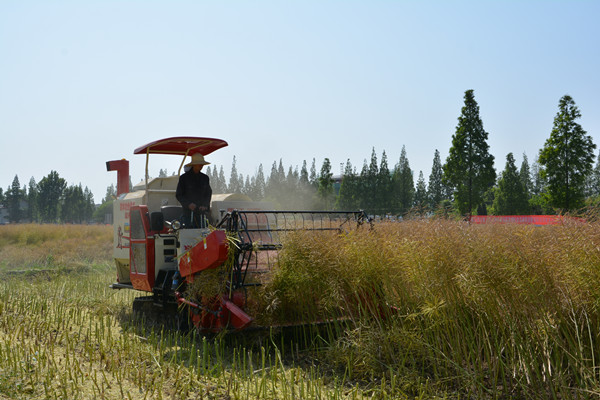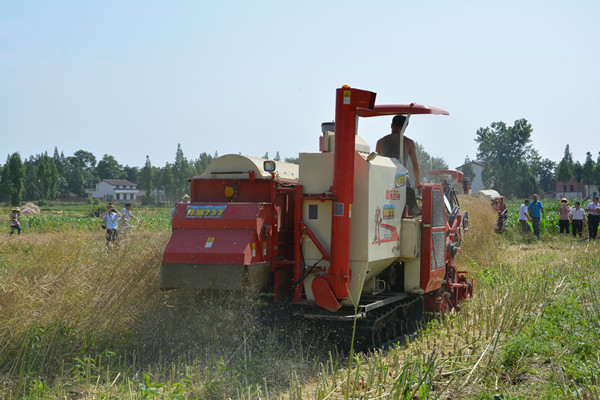 與會(huì)人員觀摩了各示范品種的機(jī)收現(xiàn)場(chǎng)。油菜聯(lián)合收獲機(jī)僅用十多分鐘就順利完成一畝油菜的收割、脫粒、秸稈粉碎全部過(guò)程,直接獲得清潔的油菜籽。隨后,旋耕機(jī)進(jìn)行滅茬作業(yè),實(shí)現(xiàn)了秸稈打碎還田,既增加土壤有機(jī)質(zhì),又避免了秸稈焚燒造成的大氣污染,保護(hù)了環(huán)境。油菜機(jī)收體現(xiàn)了效率高、節(jié)本增效好、田間損失少、秸稈利用好等特點(diǎn),受到與會(huì)代表和群眾連聲贊嘆。