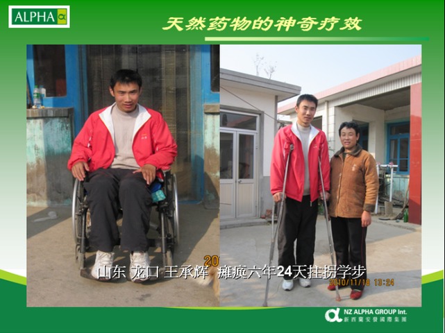 這位小伙子是山東龍口的王承輝,因為被車撞導致癱瘓,六年坐輪椅。開始她媽媽根本不相信天然藥物,說:吃過很多的保健品都沒有效果。經(jīng)過工作人員的細心解釋和解答,終于下定決心把家里的苞谷等賣了湊到3000多買了20多天的藥,想不到奇跡出現(xiàn)了:小伙子服用24天就可以拄拐學步了!有經(jīng)過一段時間的治療,現(xiàn)在已經(jīng)痊愈!