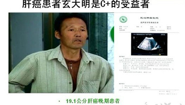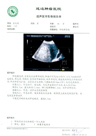 這位是牡丹江的,叫玄大明,46歲,他的肝癌19.1公分大,有巴掌大.在天津腫瘤醫(yī)院住了7個多月花了12萬,通過我們的天然藥物在25天縮小到5.9公分.在09年的6月4號開始服用我們的產(chǎn)品,原來醫(yī)院說這個人只有一年的生命,但現(xiàn)在這個人還活得好好的.這就是一個生命的奇跡.