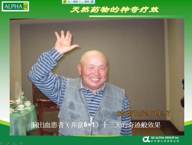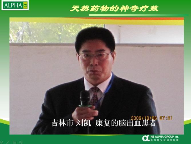 這位是吉林市的太極拳學會的會長,是位腦出血患者,他的父親是吉林市著名的老中醫(yī)每天給他推拿、針灸、效果都不明顯,通過服用我們的產(chǎn)品,短短幾個月的治療,得到康復性的治愈,沒有留下任何的后遺癥。為了讓更多人能得到我們產(chǎn)品的幫助,父子倆也在努力的推廣天然藥物!