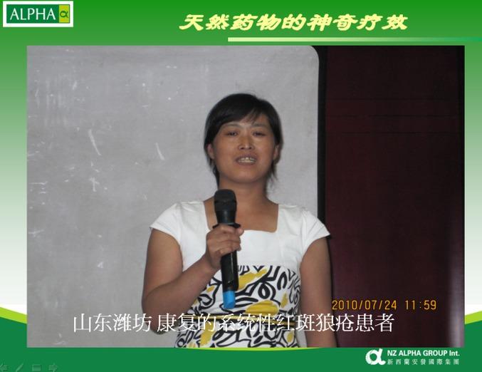 這位是系統(tǒng)紅斑狼瘡患者,看病基本上花完了家里所有的積蓄--幾十萬,她老公拿回安發(fā)的天然藥物不肯吃,說:算了吧,還是留點錢給孩子吧,老公勸了三天三夜,試著服用了產(chǎn)品,沒想到真的奇跡出現(xiàn)了,4個多月下來這個病者已經(jīng)痊愈,這是她在產(chǎn)品說明會上激動的心情分享天然藥物對她的幫助!