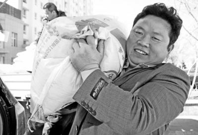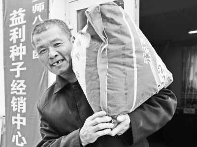 上圖為二連棉花種植戶朱明志將選購的棉種搬回家。下圖為二連棉農(nóng)在搬卸農(nóng)資公司調(diào)送的棉種。 潘廣發(fā)攝