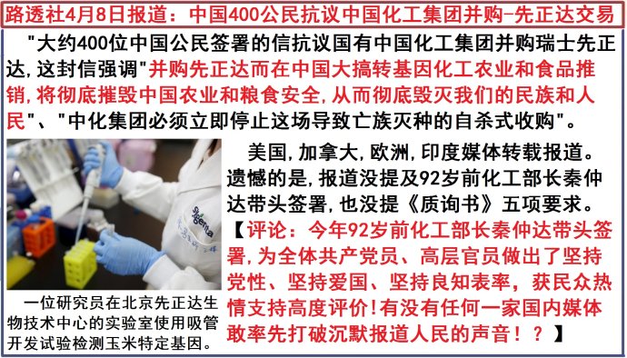 摘要:路透社4月8日報道"大約400位中國公民簽署了一封信,抗議國有中國化工集團并購瑞士種子與農(nóng)藥公司先正達,他們說該項交易最終將導致全國各地播種轉(zhuǎn)基因作物"。國務(wù)院國有資產(chǎn)監(jiān)督管理委員會的一位女發(fā)言人說,她的辦公室還沒有看到這封信,但是正在關(guān)注這件事。