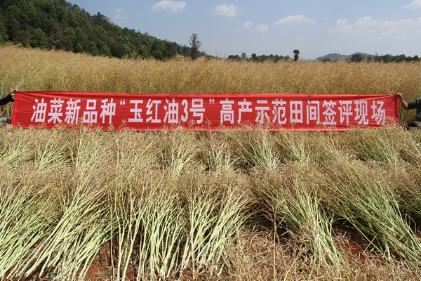 “玉紅油3號(hào)”在云南省逐年擴(kuò)大示范推廣面積,2016年在紅塔區(qū)洛河鄉(xiāng)示范面積4536畝。4月8日,由玉溪市科技獎(jiǎng)勵(lì)委員會(huì)辦公室主持,邀請(qǐng)省市區(qū)有關(guān)專家組成專家委員會(huì),對(duì)紅塔區(qū)種子管理站選育的“早熟、高含油量油菜新品種 ‘玉紅油3號(hào)’”進(jìn)行田間鑒評(píng)。