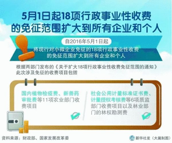 4月28日,財政部網(wǎng)站發(fā)布《關于擴大18項行政事業(yè)性收費免征范圍的通知》:自5月1日起,擴大18項行政事業(yè)性收費免征范圍。
