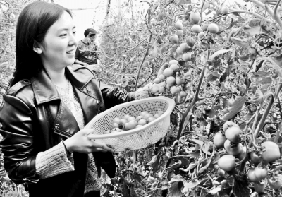 近日,江蘇省東海縣白塔埠鎮(zhèn)前營蔬菜專業(yè)合作社生產(chǎn)的綠寶石小番茄上市,供不應求,每公斤售價高達二十元。綠寶石小番茄為北京農(nóng)林科學院蔬菜研究中心最新選育綠熟特色一代雜交小番茄品種。果實圓球形,綠色透亮似綠寶石,單果重20克左右,果味酸甜濃郁,口感極佳。圖為游客在采摘成熟的果實。 徐黽李本連攝