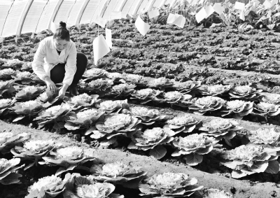 近年來(lái),河北省青縣在推進(jìn)農(nóng)業(yè)結(jié)構(gòu)調(diào)整過(guò)程中,瞄準(zhǔn)服務(wù)京津市場(chǎng)菜籃子,引導(dǎo)扶持農(nóng)民種植綠色無(wú)公害果蔬。圖為農(nóng)技人員在青縣司馬莊綠豪農(nóng)業(yè)專業(yè)合作社蔬菜大棚內(nèi)查看農(nóng)作物生長(zhǎng)情況?! ⌒氯A社記者牟宇攝
