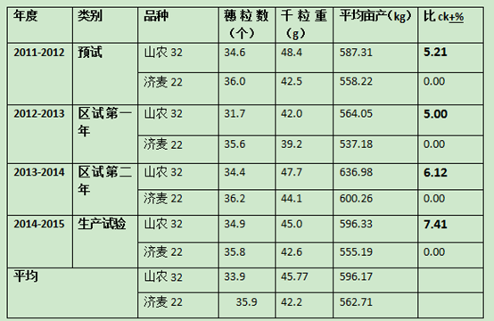 山農(nóng)32參加的是山東省高肥組審定試驗(yàn),對(duì)照品種即為濟(jì)麥22,在幾輪交手中,山農(nóng)32始終占據(jù)上風(fēng),豐產(chǎn)性、抗倒性、抗病性、抗凍性皆?xún)?yōu)于濟(jì)麥22。