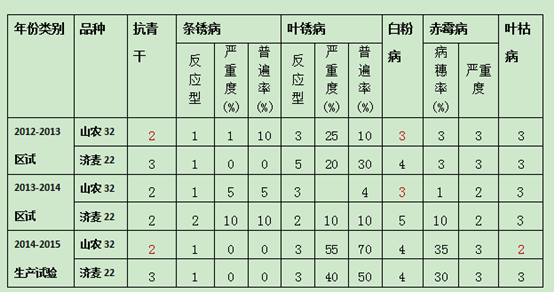 從現(xiàn)有的區(qū)試、生產(chǎn)試驗(yàn)三年的抗性統(tǒng)計(jì)數(shù)據(jù)中可以看出,山農(nóng)32對(duì)白粉病、青枯病的抗性有兩年優(yōu)于濟(jì)麥22,一年與之持平;