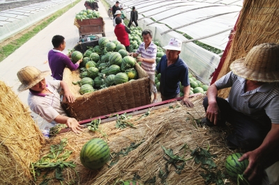5月10日,山東省泗水縣泗河街道西曲泗村王均榮家的大棚西瓜被江蘇客商以每公斤2.5元的價格訂購。臨近5月中旬,該村1300畝大棚西瓜陸續(xù)成熟上市。近年來,泗水縣加大結(jié)構(gòu)調(diào)整力度,突出地方特色種植,以京欣2號為主打品種,打造了10萬畝西瓜種植區(qū),產(chǎn)品深受市場青睞,銷往北京、上海等各大城市。 包慶淼攝