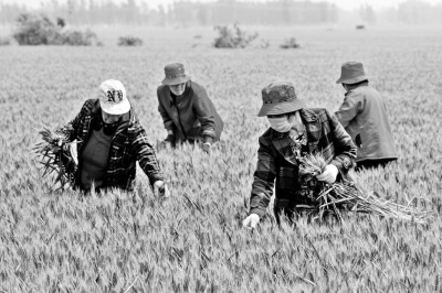5月11日,河南省滑縣城關(guān)鎮(zhèn)林陽農(nóng)民種植專業(yè)合作社的小麥種子繁育基地里,農(nóng)民正拔除雜穗、劣株,確保種子純度。