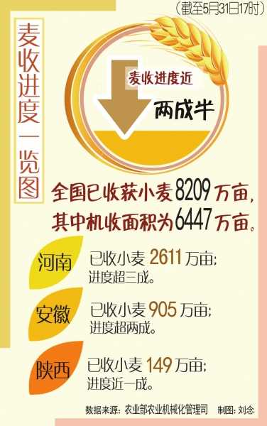 本報(bào)訊(范亞旭記者張培奇)近日,記者從河南省農(nóng)業(yè)廳獲悉,河南省8100多萬(wàn)畝小麥自南向北陸續(xù)成熟,南陽(yáng)、鄧州、駐馬店等地小麥已開(kāi)始大面積收割。據(jù)農(nóng)情調(diào)度反映,今年河南小麥長(zhǎng)勢(shì)較好,成產(chǎn)三要素呈“兩增一減”趨勢(shì),畝穗數(shù)減少,穗粒數(shù)增加,千粒重略增。