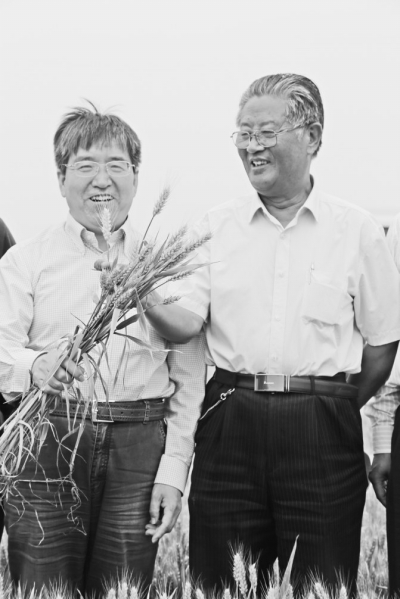 近日,中國農(nóng)科院作物科學(xué)研究所分別在河南省三門峽市、洛陽市和新鄉(xiāng)市召開了“中麥895”和“中麥175”小麥品種現(xiàn)場觀摩會。圖為中國農(nóng)科院作物科學(xué)研究所研究員,國家小麥改良中心主任何中虎博士(左)與全國勞模小麥育種專家鄭天存一起觀看“中麥895”種植田的長勢表現(xiàn)。 孫志剛攝