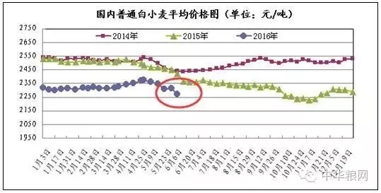 本周(6月13日-6月16日),全國已收獲冬小麥超過2.8億畝,麥?zhǔn)者M(jìn)度過八成,小麥品質(zhì)堪憂。截至6月16日,全國主要糧油批發(fā)市場三等白麥交易均價為2272元/噸,周比跌43元/噸,較去年同期下跌150元/噸,同比下跌6.19%。2016年第23期中儲糧全國小麥?zhǔn)召弮r格指數(shù)135.91,周比下跌0.17%