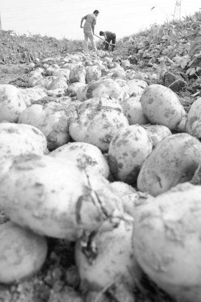 6月12日,山東省陽谷縣閻樓鎮(zhèn)周莊村農(nóng)民周忠野一家正在地里收刨“費(fèi)烏瑞它”荷蘭一級脫毒馬鈴薯。今年春天,周忠野引進(jìn)種植了4畝“費(fèi)烏瑞它”荷蘭一級脫毒地膜馬鈴薯做試驗(yàn),現(xiàn)已成熟收獲,預(yù)計平均畝產(chǎn)5000多斤。按目前批發(fā)價每斤1.5元計算,除去成本,每畝純收入6500多元。據(jù)介紹,該品種黃皮黃壤,橢圓狀形,個頭大,口感好,抗旱耐寒,耐貯藏,高產(chǎn)抗病性強(qiáng),無毒,容易種植管理,市場銷路好,價格每斤比一般馬鈴薯高0.2~0.4元。圖為周忠野一家正在地里收收獲馬鈴薯。 陳清林?jǐn)z