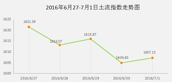 本周期末(2016年7月1日)的1607.13比上期期末(2016年6月24日)的1627.88下降20.75個基點,跌幅1.3%。本周期末較去年同期(2015年7月1日)上漲4.2個百分點,比年初上漲3.3個百分點。