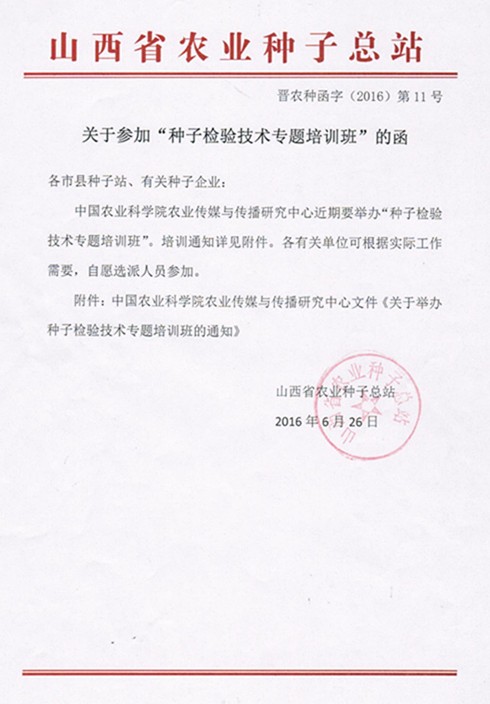 山西省關(guān)于參加種子檢驗(yàn)技術(shù)專題培訓(xùn)班的函
