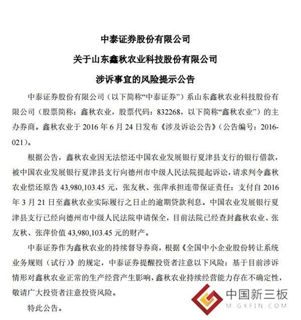 特別值得注意的是,在董事長連續(xù)減持后,這家公司還惹上了官司。鑫秋農(nóng)業(yè)在2016年6月24日發(fā)布公告稱“因無法償還中國農(nóng)業(yè)銀行的銀行借款,被提起訴訟并判令償還43980103.45元,張友秋、張萍承擔(dān)連帶責(zé)任。”