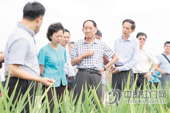 7月7日,袁隆平院士率育種專家團隊走進新會三江,考察超級雜交稻試驗田種植情況。