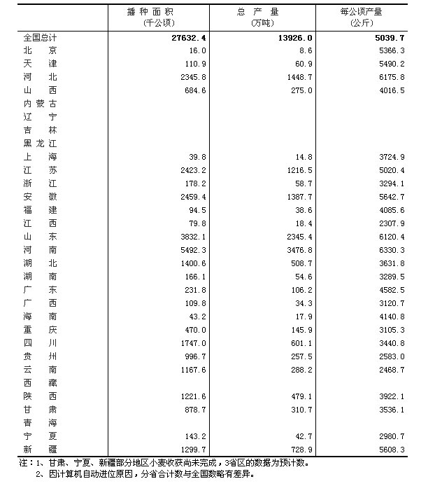 甘肅、寧夏、新疆地區(qū)由于小麥成熟較晚,目前夏糧數(shù)據(jù)為初步預(yù)計數(shù)。