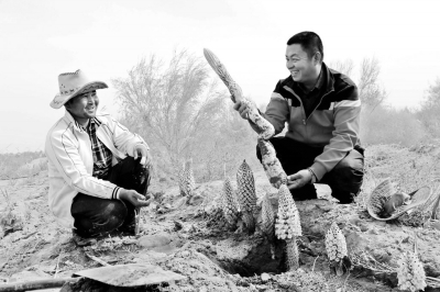 圖為劉知林(右)查看肉蓯蓉長(zhǎng)勢(shì)。