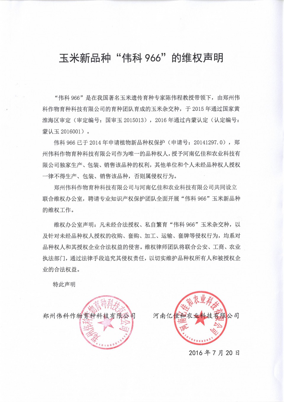 偉科966已于2014年申請植物新品種權(quán)保護(hù)(申請?zhí)枺?0141297.0),鄭州偉科作物育種科技有限公司作為唯一的品種權(quán)人,授予河南億佳和農(nóng)業(yè)科技有限公司獨家生產(chǎn)、包裝、銷售該品種的權(quán)利,其他單位和個人未經(jīng)品種權(quán)人授權(quán)一律不得生產(chǎn)、包裝、銷售該品種,否則屬侵權(quán)行為。