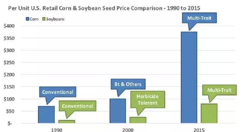 在此期間,玉米種子的零售價(jià)格從大約65刀/袋漲到300刀/袋(含有多價(jià)基因疊加的性狀)。