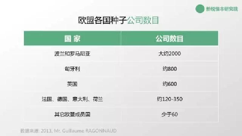 顯然上面提到的“ 7000 ”指的是整個(gè)歐盟的種子公司(包括服務(wù)類型,專業(yè)型等公司)。這樣的邏輯不可能蒙蔽了歐盟的普通公民,他們不可能認(rèn)為親本種子繁殖戶,種子生產(chǎn)戶等也是種子公司。"7000"就是忽悠公民的借口。由于沒有合適行業(yè)數(shù)據(jù)來源和相關(guān)數(shù)據(jù)太少。也許是因擔(dān)心商業(yè)機(jī)密泄露使得競(jìng)爭(zhēng)對(duì)手占上風(fēng),各類種業(yè)公司相關(guān)數(shù)據(jù)一直以來非常匱乏。