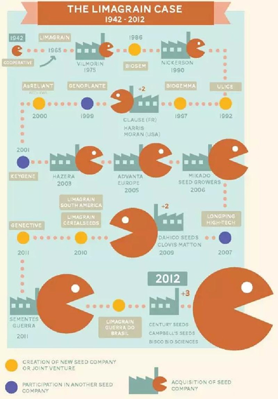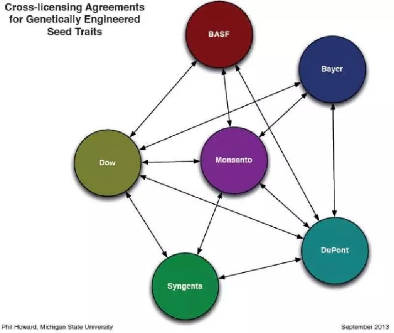 從1988年到2015年,孟山都(Monsanto)、陶氏(Dow AgroScience)、杜邦(Dupont)、先正達(dá)(Syngenta)和艾科瑞蓮(AgReliant- 科沃施KWS和利馬格蘭 Limagrain的合資公司)共進(jìn)行了大約75次并購(gòu)。