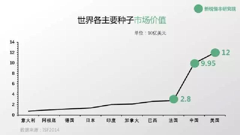 據(jù)2014年的數(shù)據(jù),中國(guó)農(nóng)作物種子市場(chǎng)價(jià)值約650億元人民幣,位居世界第二位,當(dāng)時(shí)便有分析認(rèn)為,中國(guó)有望在2015年超越美國(guó)成為全球最大的種子銷售市場(chǎng)。外界認(rèn)為,中國(guó)化工收購(gòu)全球第三大種子公司先正達(dá),重要原因之一便是看中其種子業(yè)務(wù)。(注:因?yàn)橄螺喌母?jìng)爭(zhēng)一定是生物技術(shù),因此應(yīng)該看重的轉(zhuǎn)基因技術(shù)。不僅中國(guó)化工,中糧集團(tuán)已經(jīng)收購(gòu)荷蘭的Nidera,該公司在南美市場(chǎng)有很高的市場(chǎng)份額。)2016年,被很多業(yè)內(nèi)人士譽(yù)為中國(guó)“種業(yè)元年”。