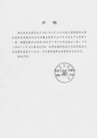 對(duì)此,甘肅恒基種業(yè)有限責(zé)任公司申請(qǐng)公安機(jī)關(guān)協(xié)助調(diào)查,最近案件有了新進(jìn)展,張掖市高臺(tái)縣農(nóng)委于2016年6月17日發(fā)布聲明:“高臺(tái)縣農(nóng)業(yè)委員會(huì)于2015年9月14日行政立案調(diào)查的甘肅恒基種業(yè)有限責(zé)任公司涉嫌未按種子生產(chǎn)許可證生產(chǎn)玉米種子一案,根據(jù)張掖市公安局2016年3月4日作出張公(經(jīng))立字(2016)5號(hào)《立案決定書》,證明該案的違法行為系賀某某與其親屬朱某某個(gè)人行為,與甘肅恒基種業(yè)有限責(zé)任公司無關(guān)。” 梁順偉