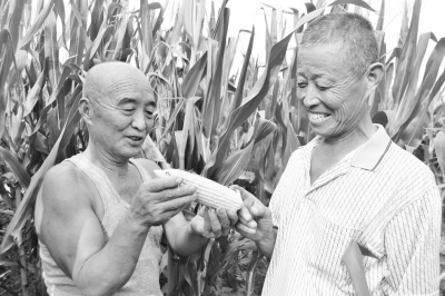 進(jìn)入成熟期,并深受市場歡迎,預(yù)計(jì)畝效益在2300元以上,比傳統(tǒng)品種效益翻了一番。圖為徐金生(左)在向鄉(xiāng)親展示成熟的鮮食玉米。 張波王建攝