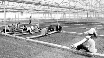 圖為工人們正在基地忙著移栽種苗的繁忙景象。 劉軍林文/圖